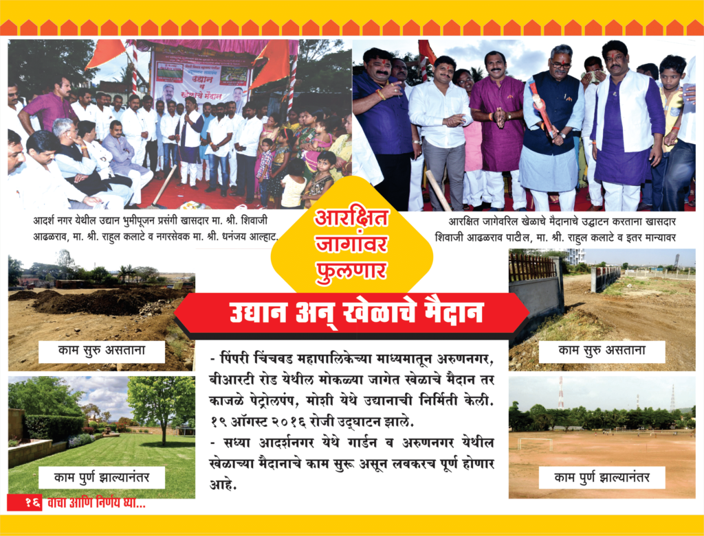 • पिंपरी चिंचवड महापालिकेच्या माध्यमातून अरुणनगर, बीआरटी रोड येथील मोकळ्या जागेत खेळाचे मैदान तर काजळे पेट्रोलपंप, मोशी येथे उद्यानाची निर्मिती केली. १९ ऑगस्ट २०१६ रोजी उद्घाटन झाले.