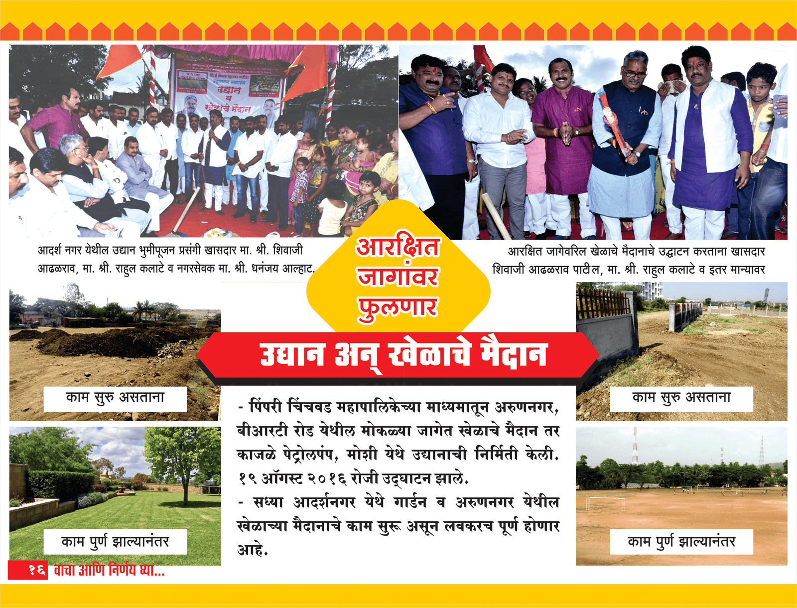 • पिंपरी चिंचवड महापालिकेच्या माध्यमातून अरुणनगर, बीआरटी रोड येथील मोकळ्या जागेत खेळाचे मैदान तर काजळे पेट्रोलपंप, मोशी येथे उद्यानाची निर्मिती केली. १९ ऑगस्ट २०१६ रोजी उद्घाटन झाले.