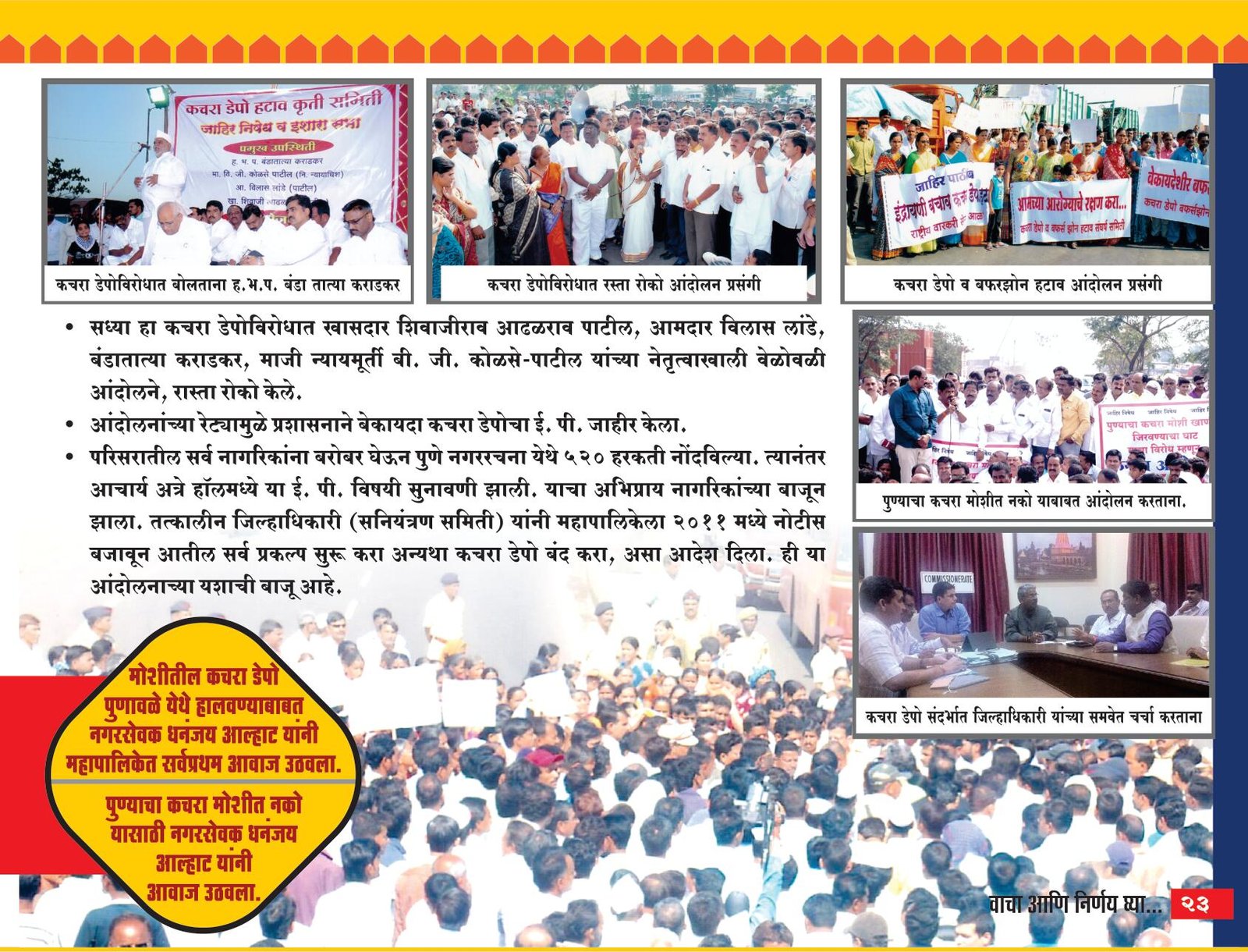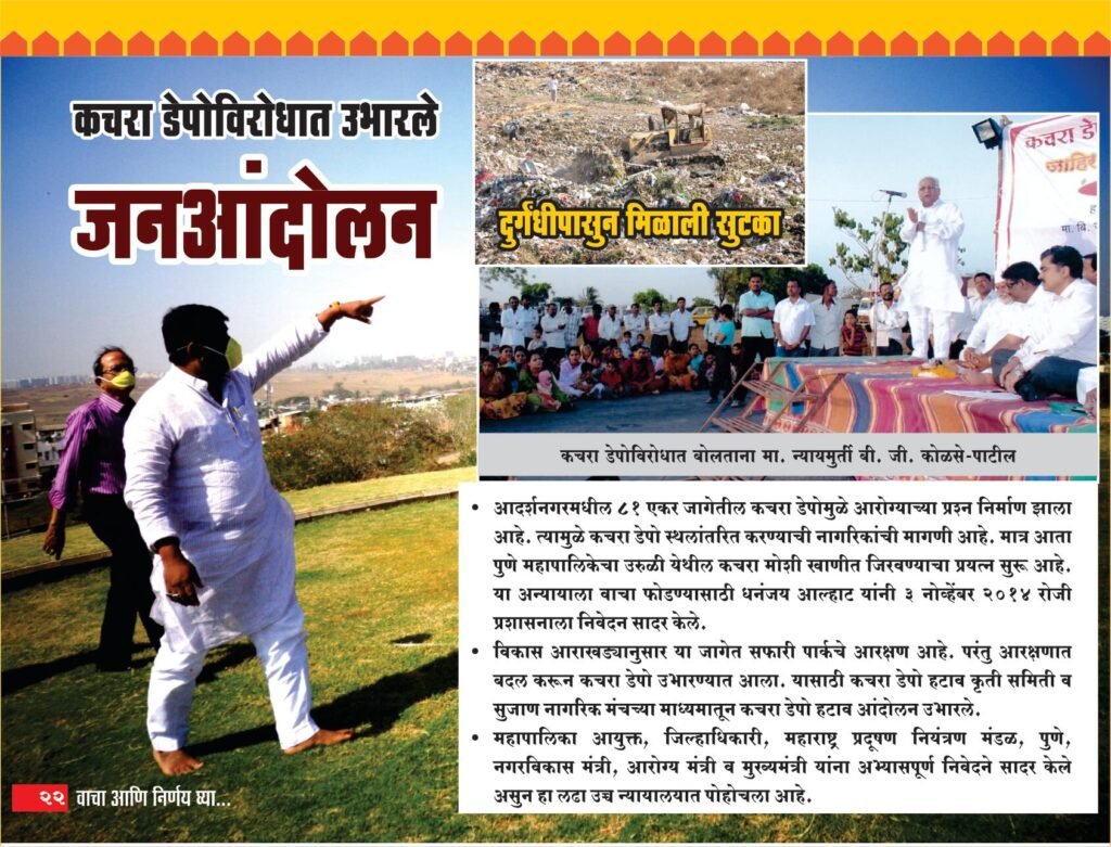 • आदर्शनगरमधील ८१ एकर जागेतील कचरा डेपोमुळे आरोग्याच्या प्रश्न निर्माण झाला आहे. त्यामुळे कचरा डेपो स्थलांतरित करण्याची नागरिकांची मागणी आहे. मात्र आता पुणे महापालिकेचा उरुळी येथील कचरा मोशी वाणीत जिरवण्याचा प्रयत्न सुरू आहे. या अन्यायाला वाचा फोडण्यासाठी धनंजय आल्हाट यांनी ३ नोव्हेंबर २०१४ रोजी प्रशासनाला निवेदन सादर केले.