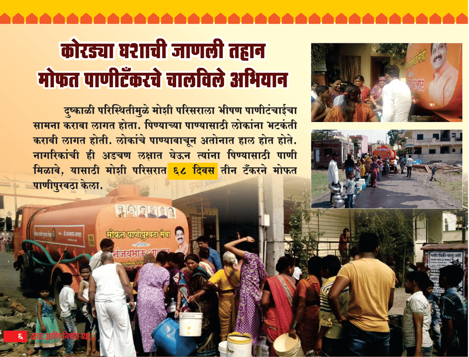 दुष्काळी परिस्थितीमुळे मोशी परिसराला भीषण पाणीटंचाईचा सामना करावा लागत होता. पिण्याच्या पाण्यासाठी लोकांना भटकंती करावी लागत होती. लोकांचे पाण्यावाचून अतोनात हाल होत होते. नागरिकांची ही अडचण लक्षात घेऊन त्यांना पिण्यासाठी पाणी मिळावे, यासाठी मोशी परिसरात ६८ दिवस तीन टँकरने मोफत पाणीपुरवठा केला.