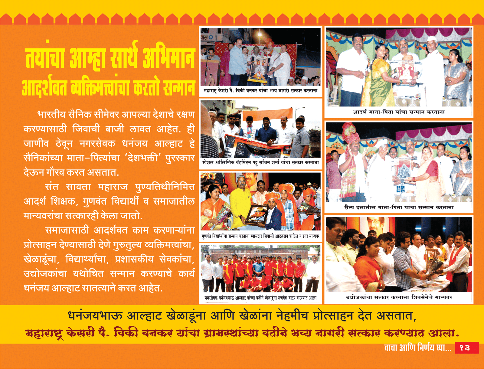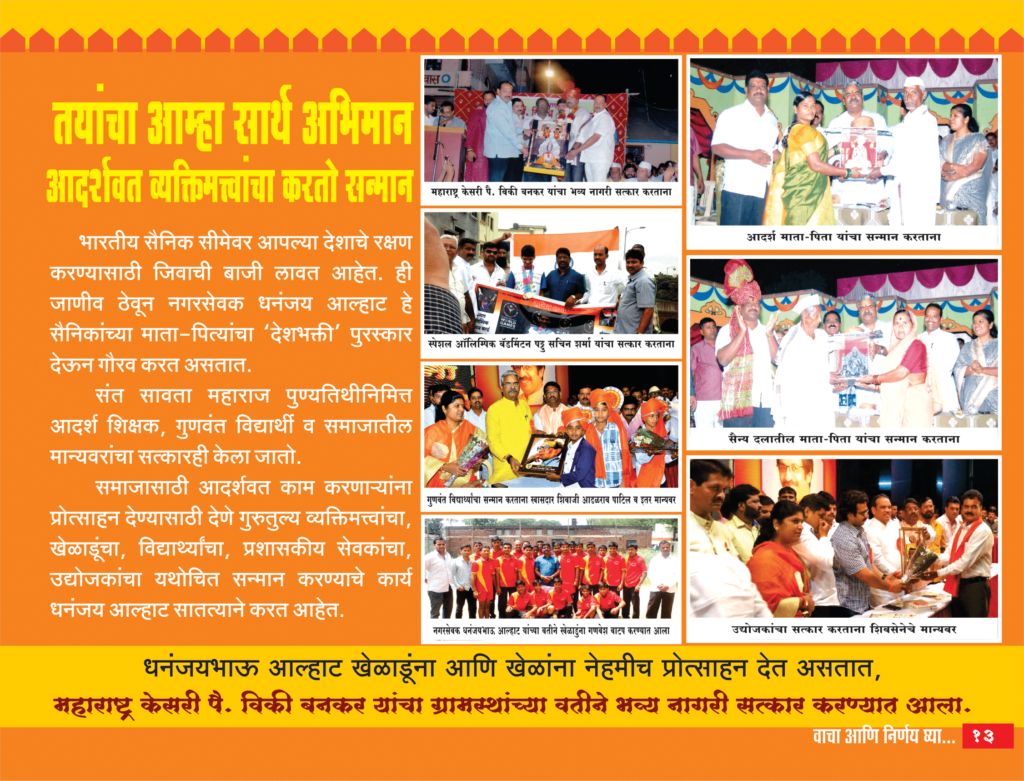 भारतीय सैनिक सीमेवर आपल्या देशाचे रक्षण करण्यासाठी जिवाची बाजी लावत आहेत. ही जाणीव ठेवून नगरसेवक धनंजय आल्हाट हे सैनिकांच्या माता-पित्यांचा ‘देशभक्ती’ पुरस्कार देऊन गौरव करत असतात.