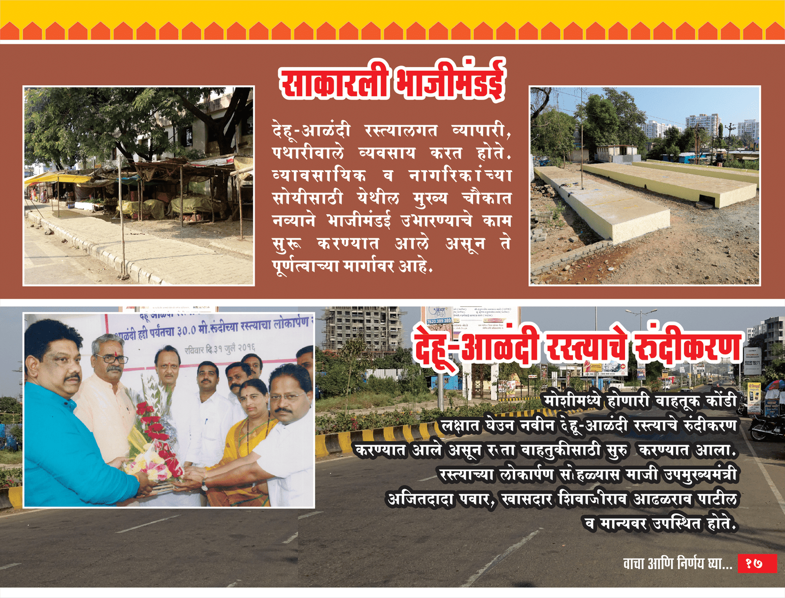 देहू-आळंदी रस्त्याचे रुंदीकरण : मोशीमध्ये होणारी वाहतूक कोंडी लक्षात घेउन नवीन देहू-आळंदी रस्त्याचे रुंदीकरण करण्यात आले असून रुता वाहतुकीसाठी सुरु करण्यात आला. रस्त्याच्या लोकार्पण सोहळ्यास माजी उपमुख्यमंत्री अजितदादा पवार, खासदार शिवाजीराव आढळराव पाटील व मान्यवर उपस्थित होते.