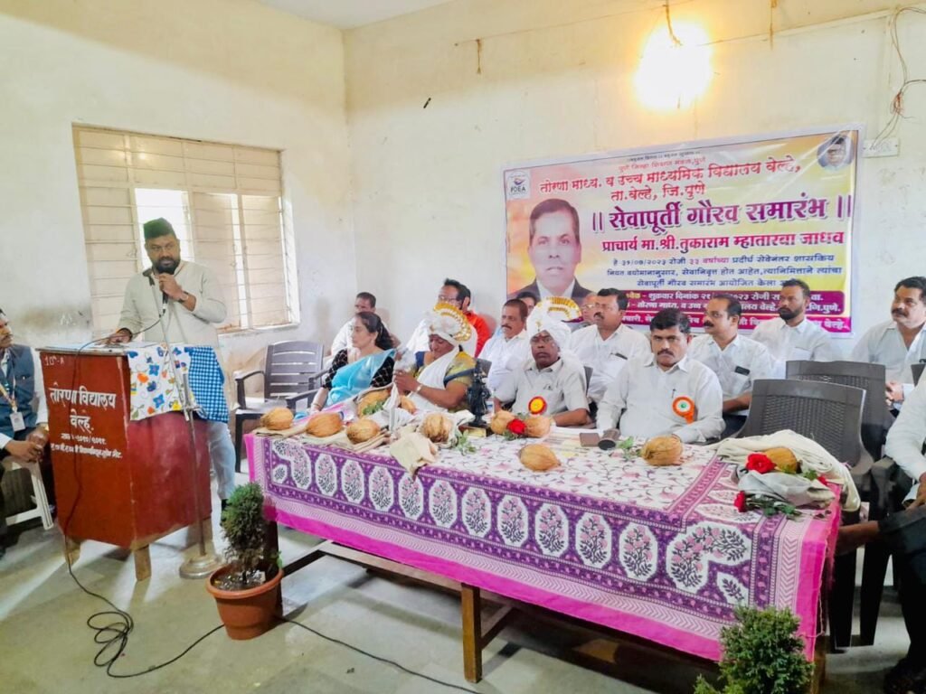 प्राचार्य मा.श्री.टी.एम. जाधव सर ( मोशी) यांच्या सेवापूतीॅ गौरव समारंभ निमित्त तोरणा माध्यमिक/उच्च माध्यमिक विद्यालय वेल्हे येथे सत्कार. नगरसेवक मा.धनंजय भाऊ आल्हाट , श्री. शांताराम बोराटे , श्री. अनिल बनकर , श्री.मोरेश्वर आल्हाट. Categories: कार्यक्रमसामाजिक 0 Comments Leave a Reply Cancel replyYour email address will not be published. Required fields are marked * Name * Email * Website What's on your mind? Save my name, email, and website in this browser for the next time I comment.