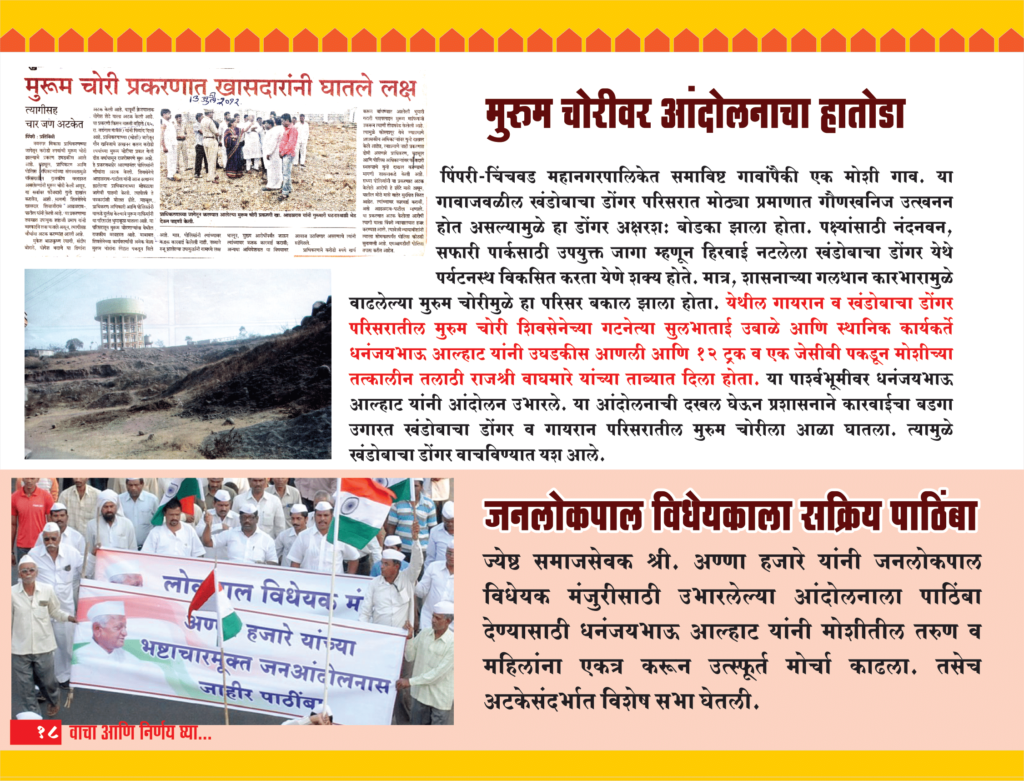 पिंपरी-चिंचवड महानगरपालिकेत समाविष्ट गावांपैकी एक मोशी गाव. या गावाजवळील खंडोबाचा डोंगर परिसरात मोठ्या प्रमाणात गौणखनिज उत्खनन होत असल्यामुळे हा डोंगर अक्षरश: बोडका झाला होता. पक्ष्यांसाठी नंदनवन, सफारी पार्कसाठी उपयुक्त जागा म्हणून हिरवाई नटलेला खंडोबाचा डोंगर येथे पर्यटनस्थ विकसित करता येणे शक्य होते. मात्र, शासनाच्या गलथान कारभारामुळे बादलेल्या मुरुम चोरीमुळे हा परिसर बकाल झाला होता. येथील गायरान व खंडोबाचा डोंगर परिसरातील मुरुम चोरी शिवसेनेच्या गटनेत्या सुलभाताई उबाळे आणि स्थानिक कार्यकर्ते धनंजयभाऊ आल्हाट यांनी उपडकीस आणली आणि १२ ट्रक व एक जेसीबी पकडून मोशीच्या तत्कालीन तलाठी राजश्री वाघमारे यांच्या ताब्यात दिला होता. या पार्श्वभूमीवर धनंजयभाऊ आल्हाट यांनी आंदोलन उभारले. या आंदोलनाची दखल घेऊन प्रशासनाने कारवाईचा बडगा उगारत खंडोबाचा डोंगर व गायरान परिसरातील मुरुम चोरीला आळा घातला. त्यामुळे खंडोबाचा डोंगर वाचविण्यात यश आले.