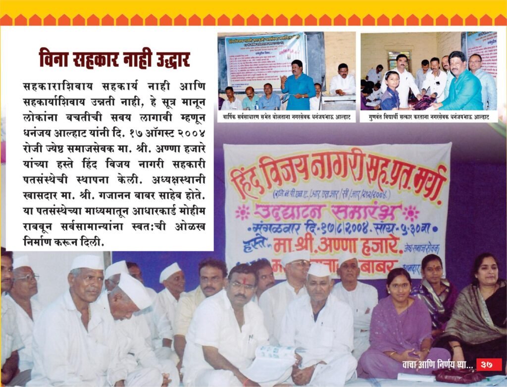 सहकाराशिवाय सहकार्य नाही आणि सहकार्याशिवाय उन्नती नाही, हे सूत्र मानून लोकांना बचतीची सवय लागावी म्हणून धनंजय आल्हाट यांनी दि. १७ ऑगस्ट २००४ रोजी ज्येष्ठ समाजसेवक मा. श्री. अण्णा हजारे यांच्या हस्ते हिंद विजय नागरी सहकारी पतसंस्थेची स्थापना केली. अध्यक्षस्थानी खासदार मा. श्री. गजानन बाबर साहेब होते. या पतसंस्थेच्या माध्यमातून आधारकार्ड मोहीम राबवून सर्वसामान्यांना स्वतःची ओळख निर्माण करून दिली.