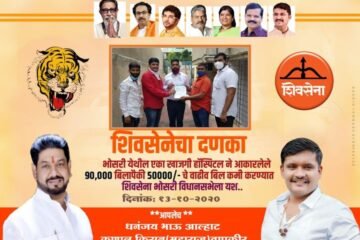शिवसेनेचा दणका* काल दिनांक 10/10/2020 *कोरोना पेशंट चे वाढीव बिल कमी करण्यात शिवसेनेला यश..* वाढीव बिलासंबंधी तक्रार मोशी मधील आल्हाट कुटुंबियाने शिवसेनेकडे केली असता त्यावर भोसरी विधानसभा प्रमुख श्री. धनंजय भाऊ आल्हाट यांच्या नेतृत्वाखाली अँड. कुणाल किसनराव महाराज तापकीर आणि सर्व शिवसैनिकांनी ताबडतोब दखल घेऊन 1,00,000/ रुपयाचे बिल कमी करण्यात Read more
